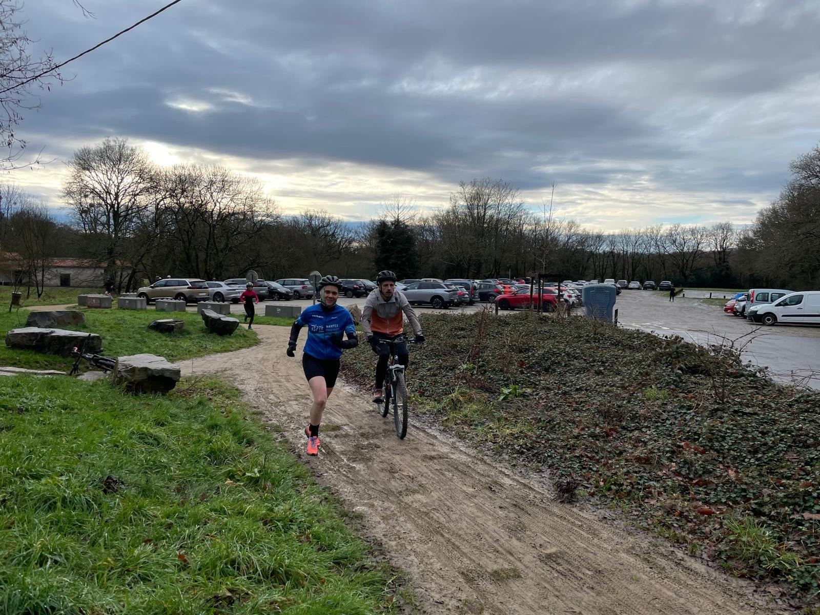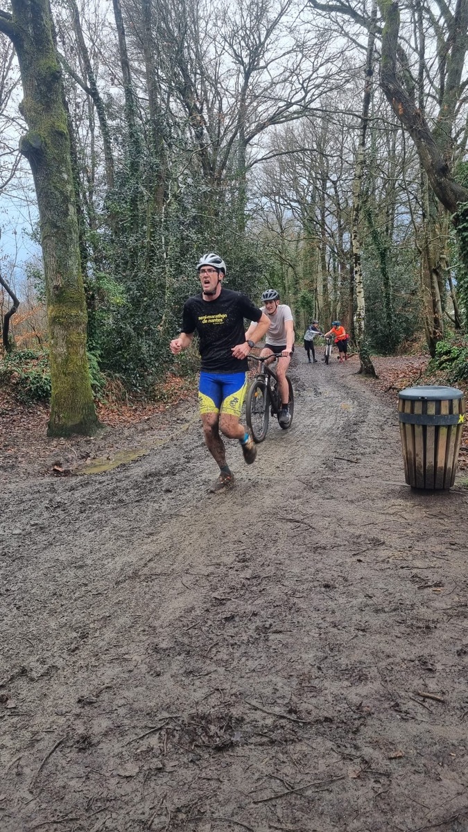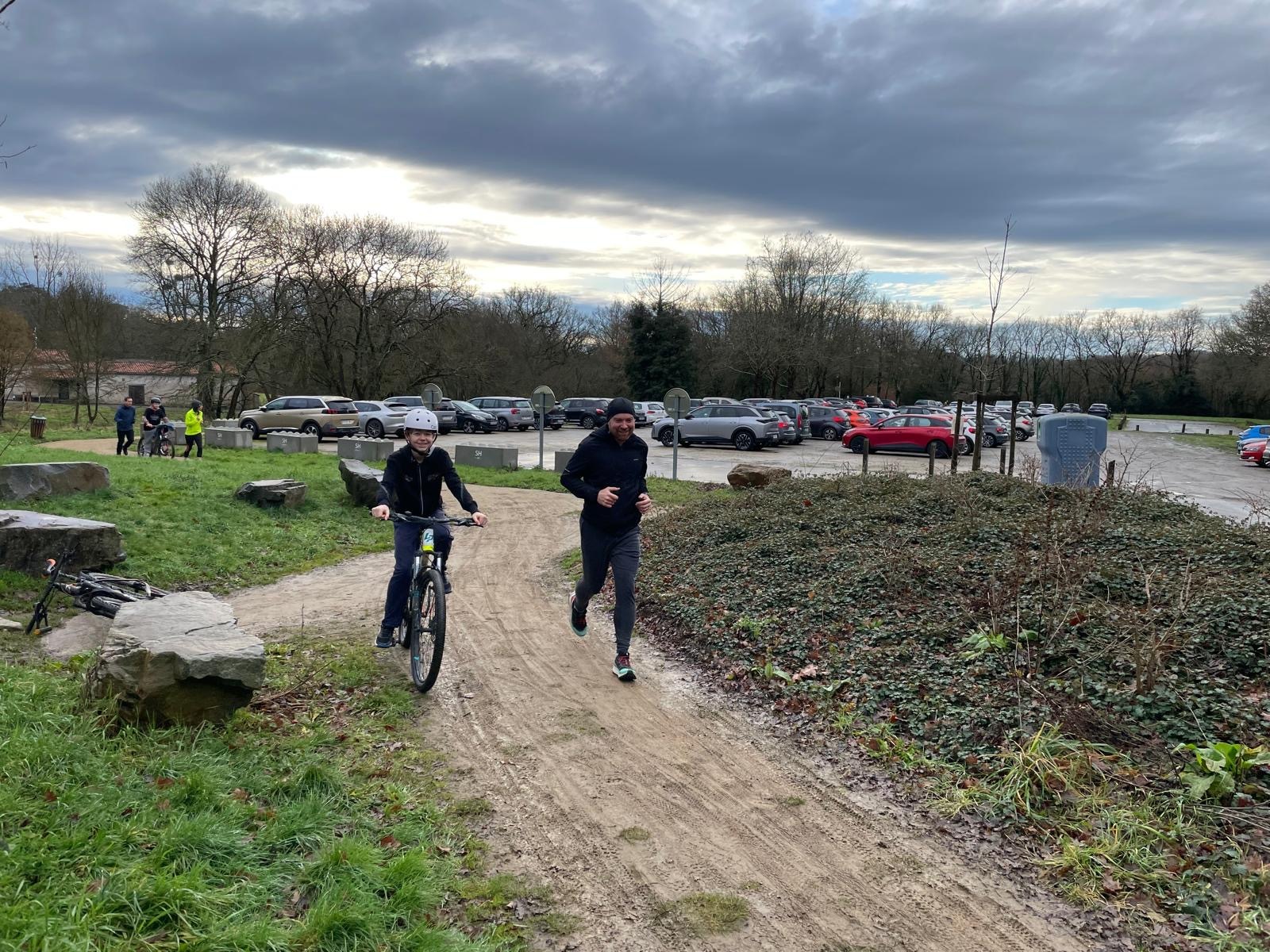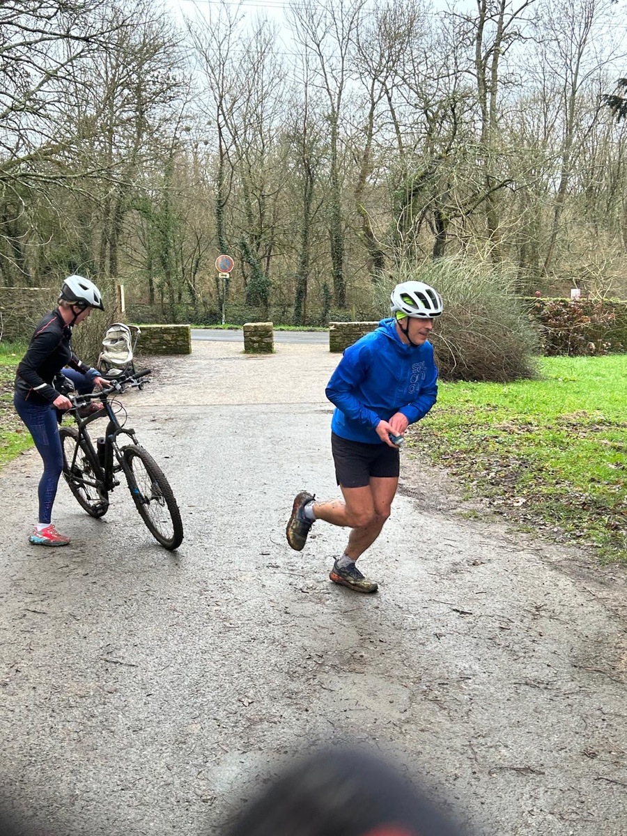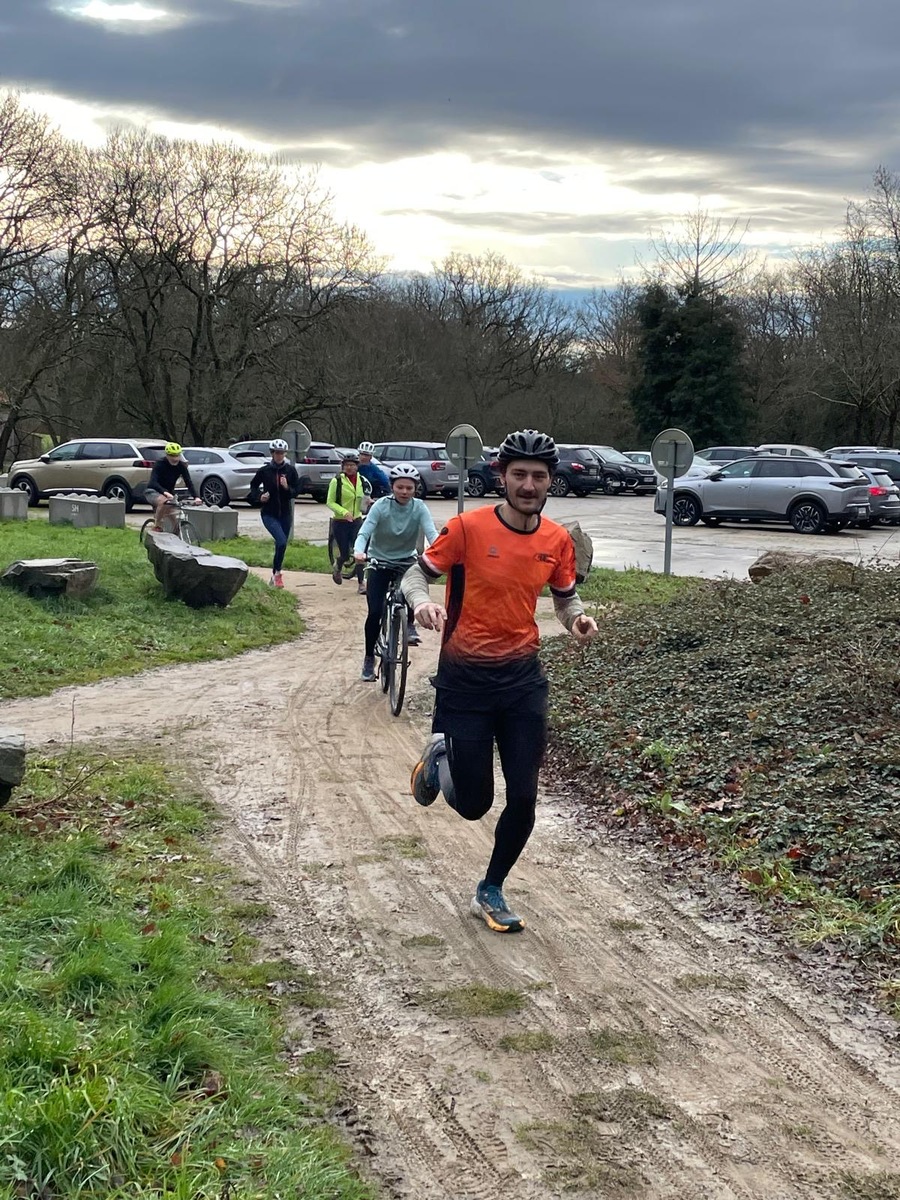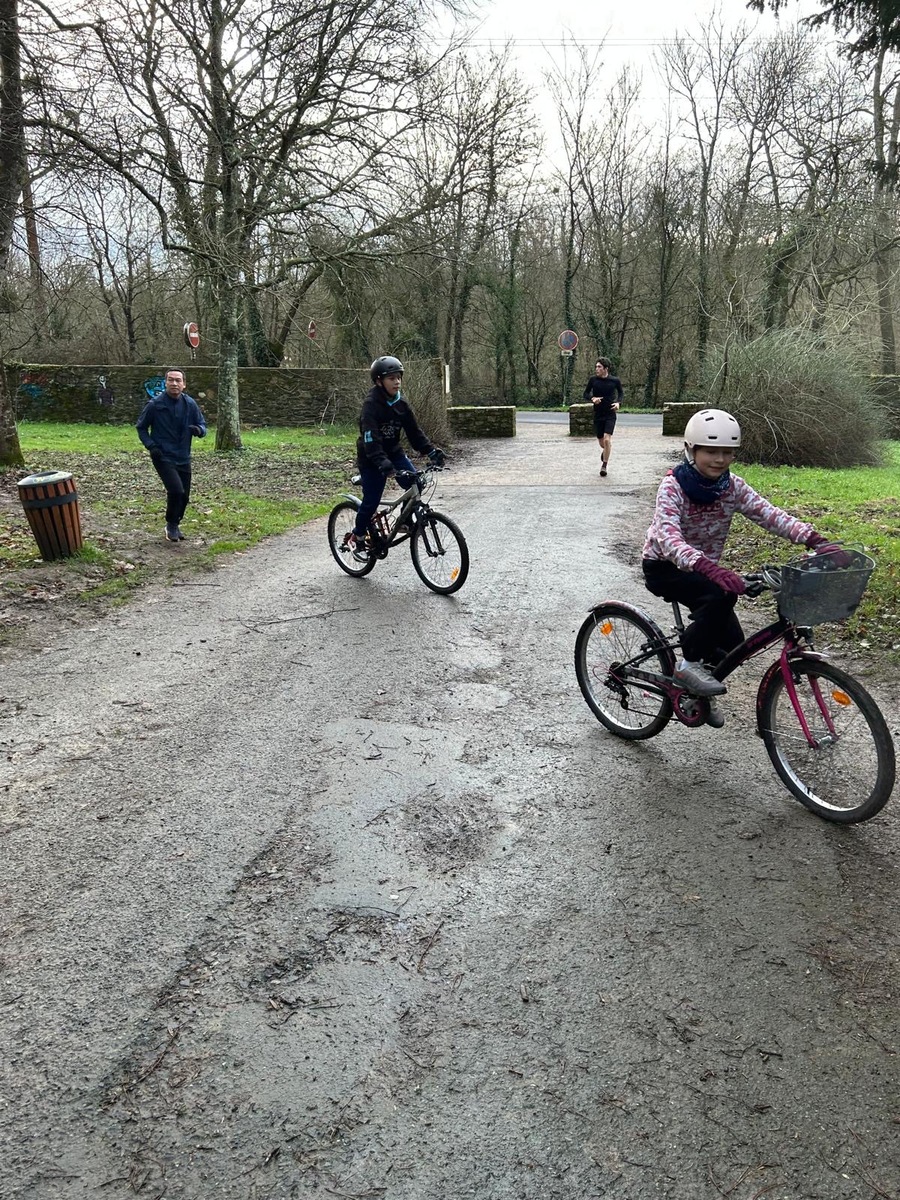 Ce Dimanche 18 Janvier la 11° Édition du Run and Bike Découverte s'est tenue dans le magnifique parc de la Gournerie a Saint Herblain , aprés une année d'interruption suite aux importants travaux conduits sur le site , cette édition était dédiée a la solidarité et a la pratique du sport Responsable . En effet , le Saint Herblain Triathlon avait décidé de promouvoir la pratique sportive responsable en s'associant avec l'association Supporterre pour sensibiliser les participants en organisant une collecte d'équipements sportifs plus utilisés afin de leur donner une seconde vie et favoriser l'economie circulaire ; une animation avec l'étonnante Juiscyclette a permis aux participants volontaires de fabriquer leur jus de fuits sans empreinte carbone a la force de leurs mollets . Sous une météo plutot douce pour la saison , les 58 équipes participantes ont pu bénéficier d'un echauffement tonique organisé par les équipiers SHT avant de s'elancer sur le circuit de 5km tracé autour du Parc sous le starter de Marine Duméril , adjointe aux Sports a la Ville de Saint Herblain . 1 , 2 ou 3 tours , chaque équipe avait le choix de son parcours pour tester sa condition physique ou découvrir le plaisir d'enchainer Vélo et Course a pied .