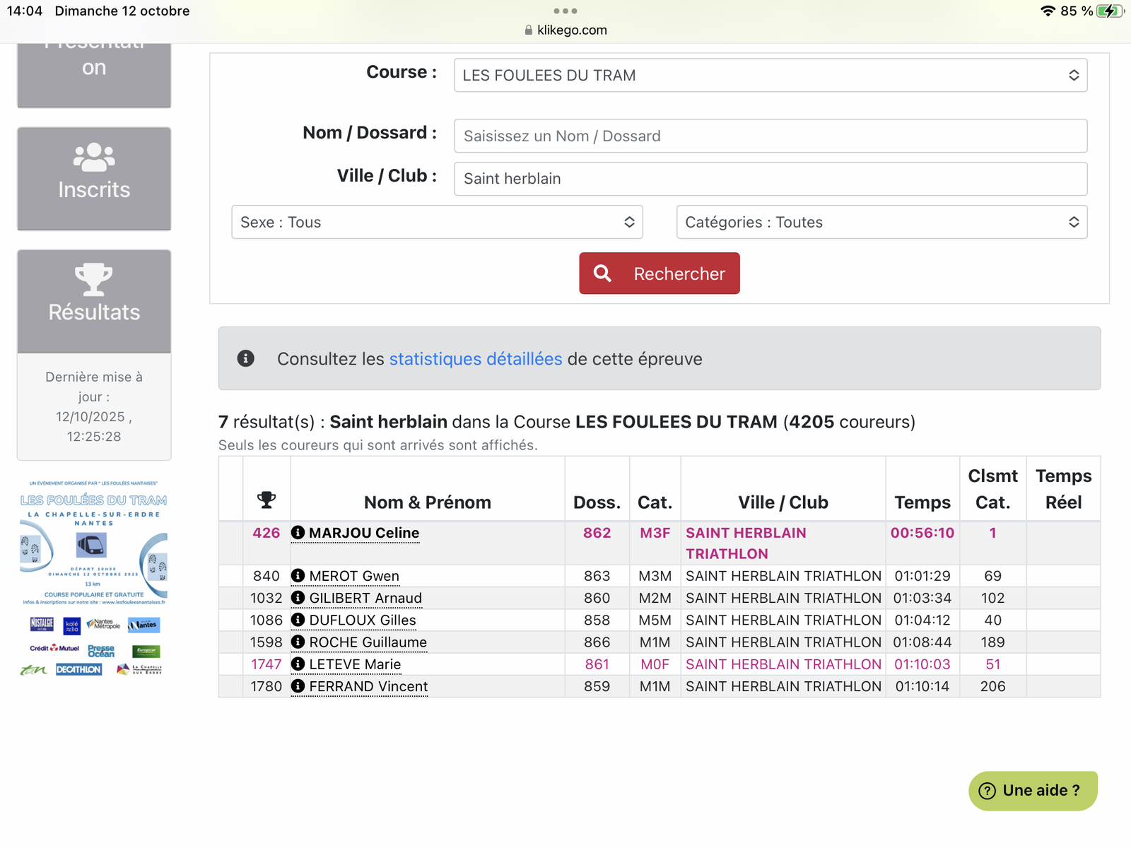 Aux Foulées du Tram , Lahcen réalise le meilleur chrono SHT en 52 minutes il termine 3° de sa catégorie aprés son trail de la veille , suivi par Céline Marjou en 56 minutes premiére de sa catégorie , Delphine Lambert en 58 minutes , Gwen Mérot 1H01 , Hugues Chignard 1H02 , Arnaud Gilibert 1H03 , Guillaume Roché 1H04 , Marie Léteve et Vincent Ferrand 1H06 .