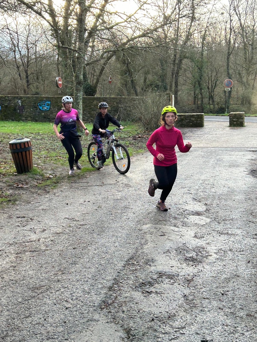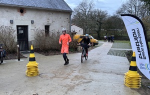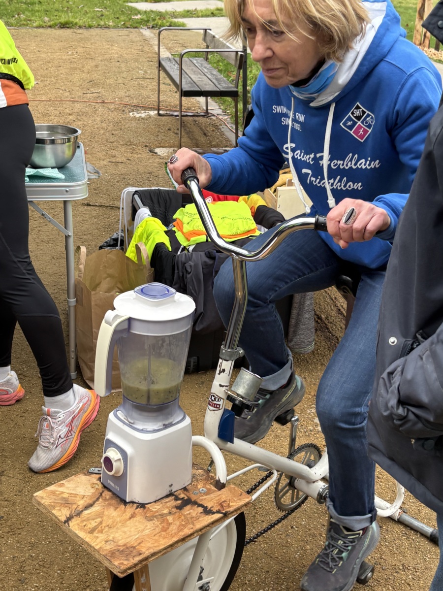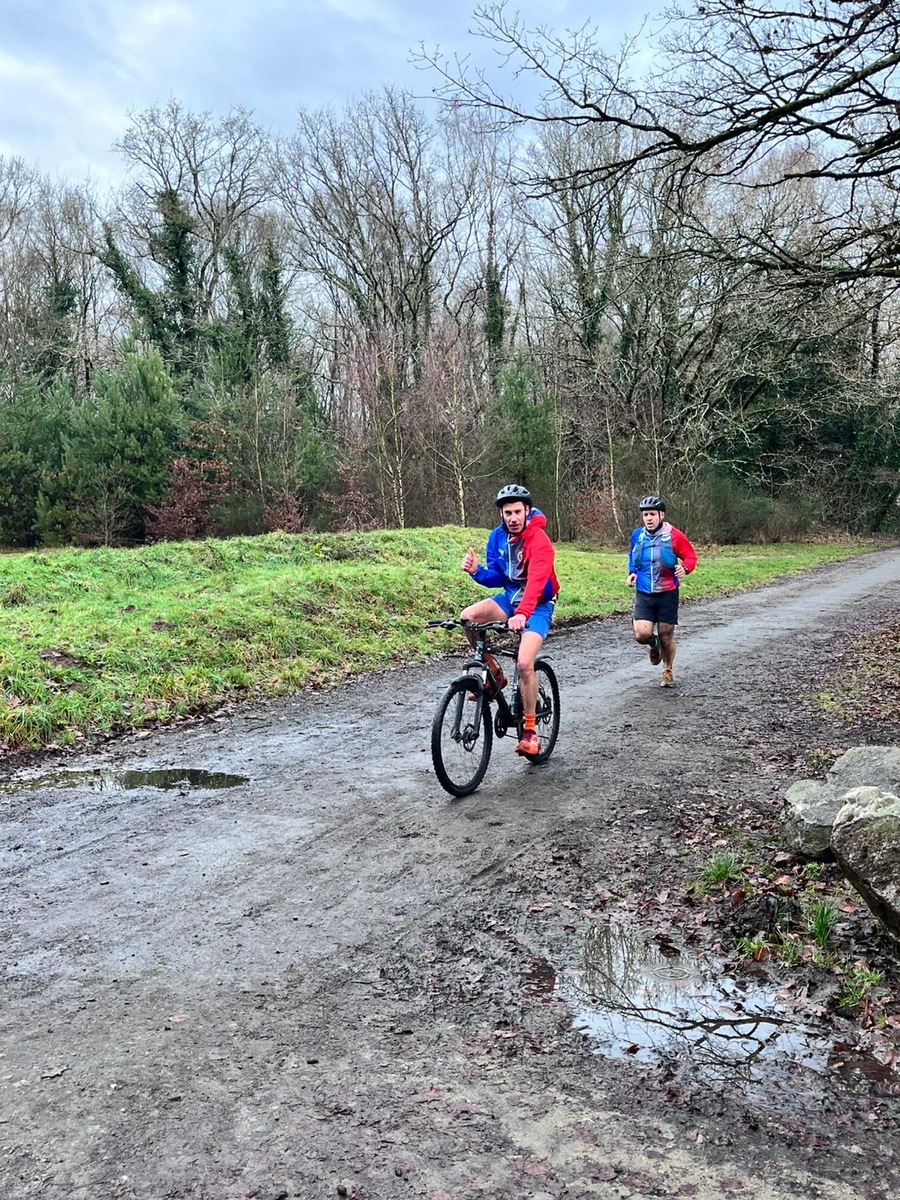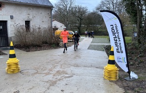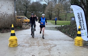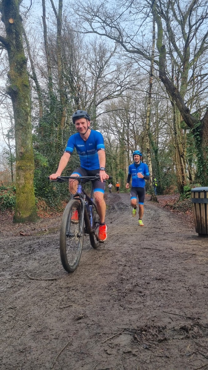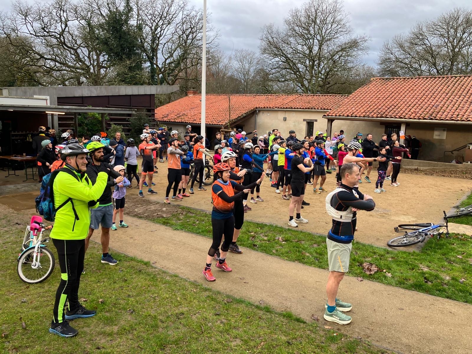 Ce Dimanche 18 Janvier la 11° Édition du Run and Bike Découverte s'est tenue dans le magnifique parc de la Gournerie a Saint Herblain , aprés une année d'interruption suite aux importants travaux conduits sur le site , cette édition était dédiée a la solidarité et a la pratique du sport Responsable . En effet , le Saint Herblain Triathlon avait décidé de promouvoir la pratique sportive responsable en s'associant avec l'association Supporterre pour sensibiliser les participants en organisant une collecte d'équipements sportifs plus utilisés afin de leur donner une seconde vie et favoriser l'economie circulaire ; une animation avec l'étonnante Juiscyclette a permis aux participants volontaires de fabriquer leur jus de fuits sans empreinte carbone a la force de leurs mollets . Sous une météo plutot douce pour la saison , les 58 équipes participantes ont pu bénéficier d'un echauffement tonique organisé par les équipiers SHT avant de s'elancer sur le circuit de 5km tracé autour du Parc sous le starter de Marine Duméril , adjointe aux Sports a la Ville de Saint Herblain . 1 , 2 ou 3 tours , chaque équipe avait le choix de son parcours pour tester sa condition physique ou découvrir le plaisir d'enchainer Vélo et Course a pied .